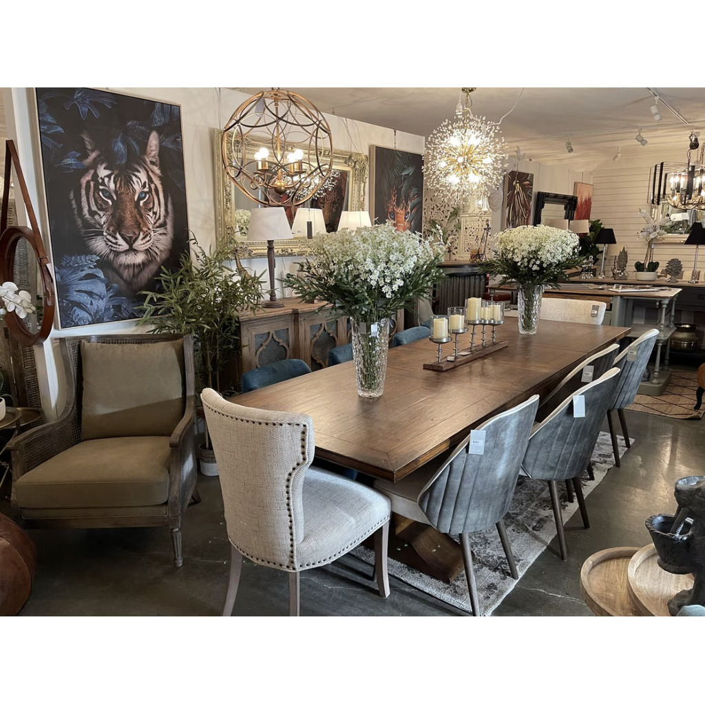THE BOSS PEDESTAL DOUBLE EXTENSION DINING TABLE SPORTS A BOLD, CLASSIC LOOK, PERFECT FOR RUSTIC OR CONTEMPORARY SETTINGS. THIS TABLE HAS A DURABLE TABLETOP SURFACE MADE FROM SOLID MANGO WOOD, ITS NATURAL COLOUR AND GRAIN BRINGS A EARTHY, WARM FEEL TO ANY DINING AREA, WHICH ALSO COMPLIMENTS HOME AND DINING DÉCOR. ITS DOUBLE EXTENDABLE DESIGN MEANS THIS BEAUTIFUL TABLE CAN EXPAND WITH YOUR GUEST LIST.